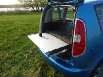 | Während der Fahrt, auch im Alltagsbetrieb, sind alle Teile des Bett-Systems im Kofferraum gut verstaut und beanspruchen nur wenig Platz. Die Ablagen ermöglichen es das Gepäck ein zu stapeln, sie können aber zum Transport größerer Gegenstände auch problemlos aus dem Fahrzeug genommen werden. Durch die untere Ablage kann eine ebener Ladeboden im Kofferraum geschaffen werden, nur selten benötigte Gegenstände und Teile des Bettes können unter der unteren Ablage verstaut werden. Die Ablagen können zum besseren Beladen nach oben geklappt werden. Bei Fahrzeugen mit ebenem Ladeboden kann die untere Ablage optional nach hinten ausgezogen werden | ![]() |
