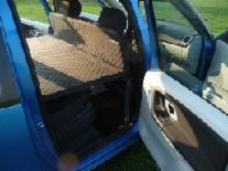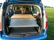 ![]() | Bett aufgebaut Der Aufbau des Bettes nimmt nur wenige Minuten in Anspruch. Bei kleineren Fahrzeugen ist eine Nutzung der vorderen Sitze dann nicht mehr möglich. Der Kofferraum und auch der der Stauraum hinter den Fahrersitzen ist durch die Heck- bzw. Seitentüren auch bei aufgebautem Bett voll zugänglich. |