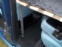 | Fahren mit aufgebautem Bett Dank der teleskopierbaren Bettschienen und des flexiblen Lattenrostes ist es möglich das Bett soweit zusammen zu schieben, dass die Vordersitze in Fahrstellung gebraucht werden können. Die Fahrt vom Campingplatz in die Stadt oder zum Strand ist so ohne große Umbauten jederzeit möglich | ![]() |